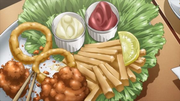 日本動漫吃什麼2022年10月11日每次動畫演到吃的,我都會忍不住流口水,還會截圖收藏,對著圖片流口水,本篇不定時更新。 戀上換裝娃娃:五條新菜的早餐 瞧瞧這美麗的擺盤…有味噌湯、鮭魚、築前煮?不知道,總之,這早餐我也好想吃…感覺健康又不會太肥。 我的重製人生:大家去卡拉OK點的拼盤 有洋蔥圈、薯條、左下應該是炸雞?